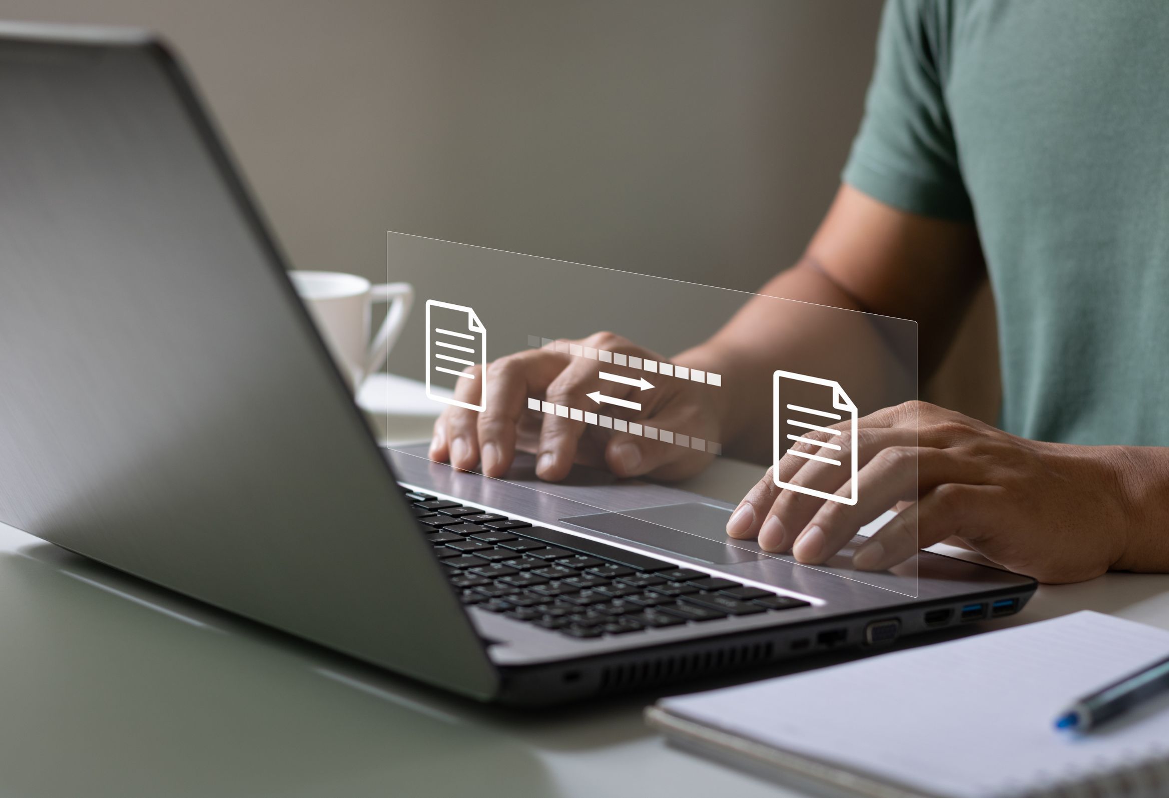 Eine Person sendet an einem Laptop Daten über einen sicheren Übertragungsweg